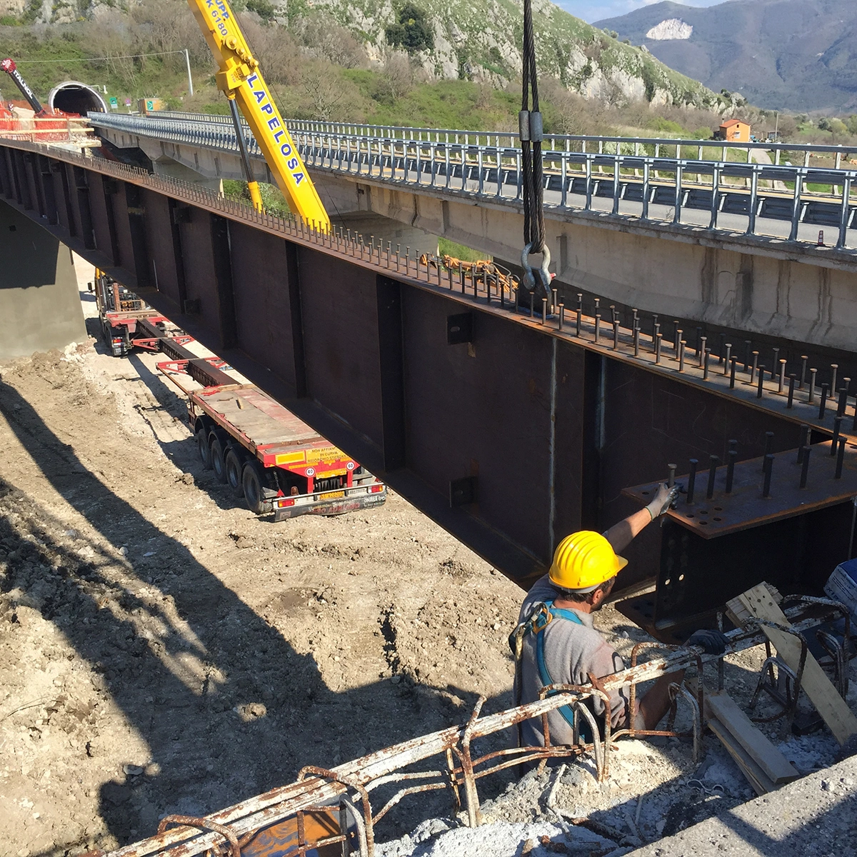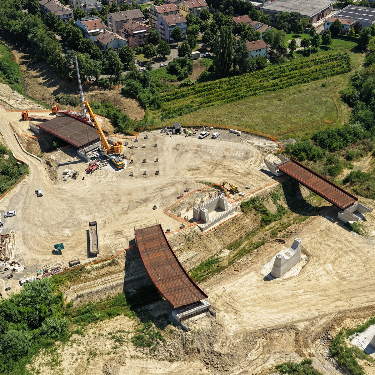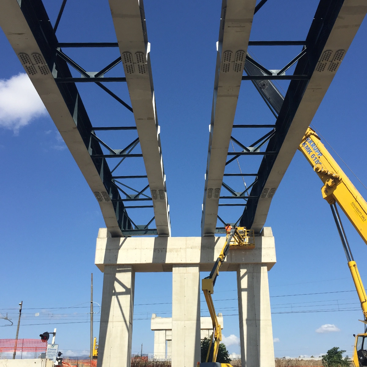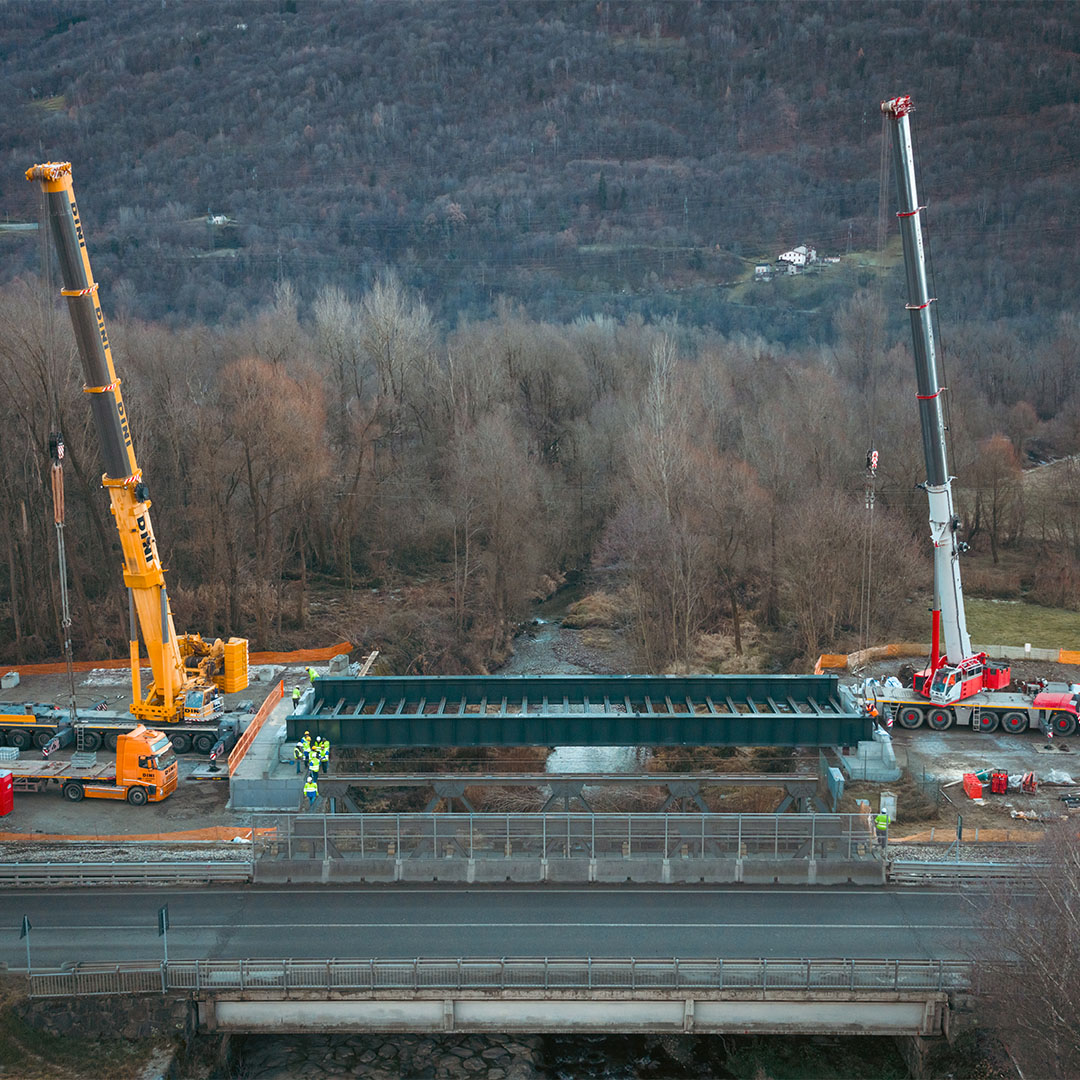 Fasi realizzative, varo: Le attività di cantiere, conseguenziali a quelle presso Stabilimento di produzione, sono state eseguite con montaggio/assemblaggio e saldatura presso le aree di cantiere (in ombra alle spalle) e successivo VARO DAL BASSO degli impalcati con idonee autogru.