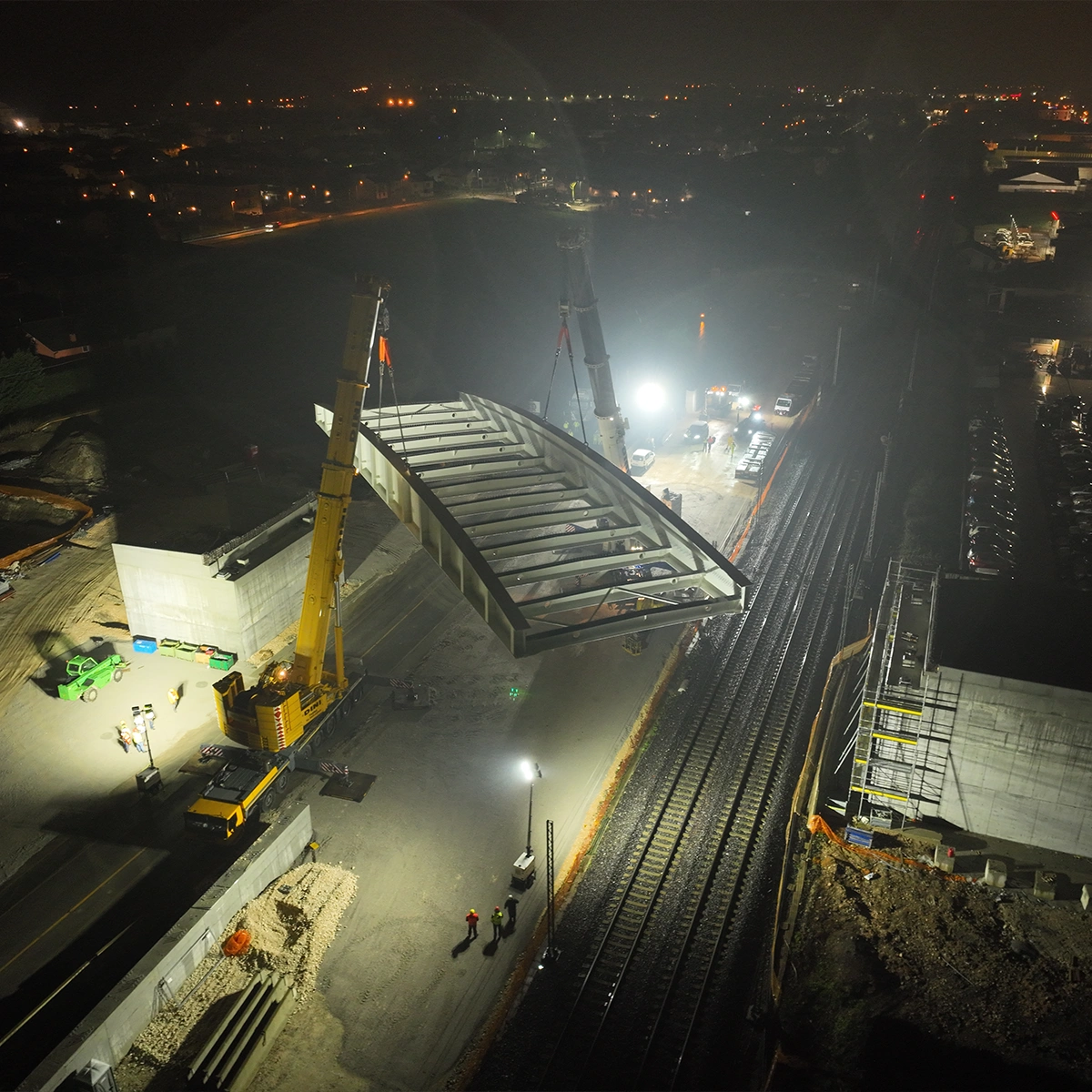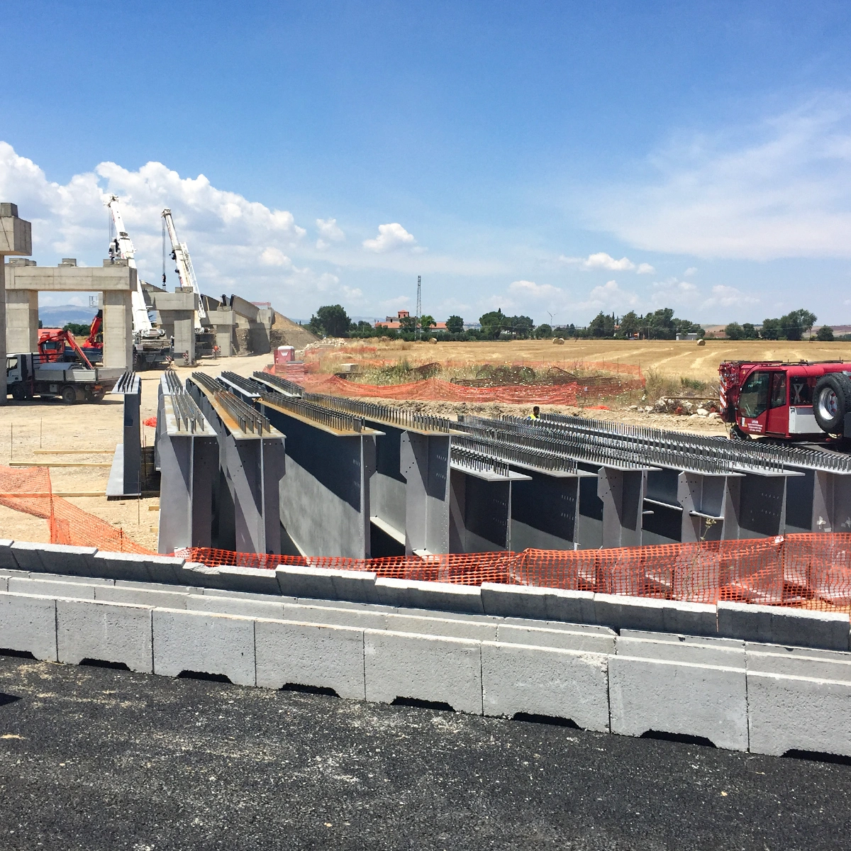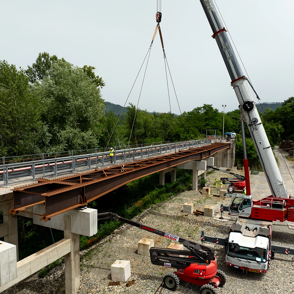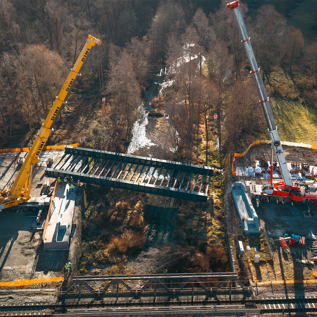 Fasi realizzative, varo: Le attività di cantiere, conseguenziali a quelle presso Stabilimento di produzione, sono state eseguite con montaggio/assemblaggio e saldatura presso le aree di cantiere (in ombra alle spalle) e successivo VARO DAL BASSO degli impalcati con idonee autogru.