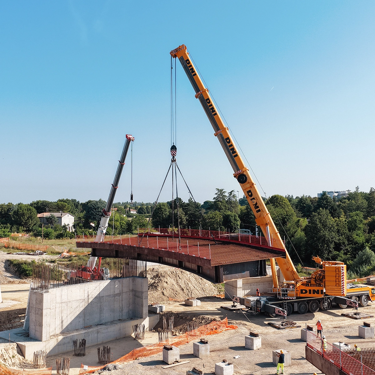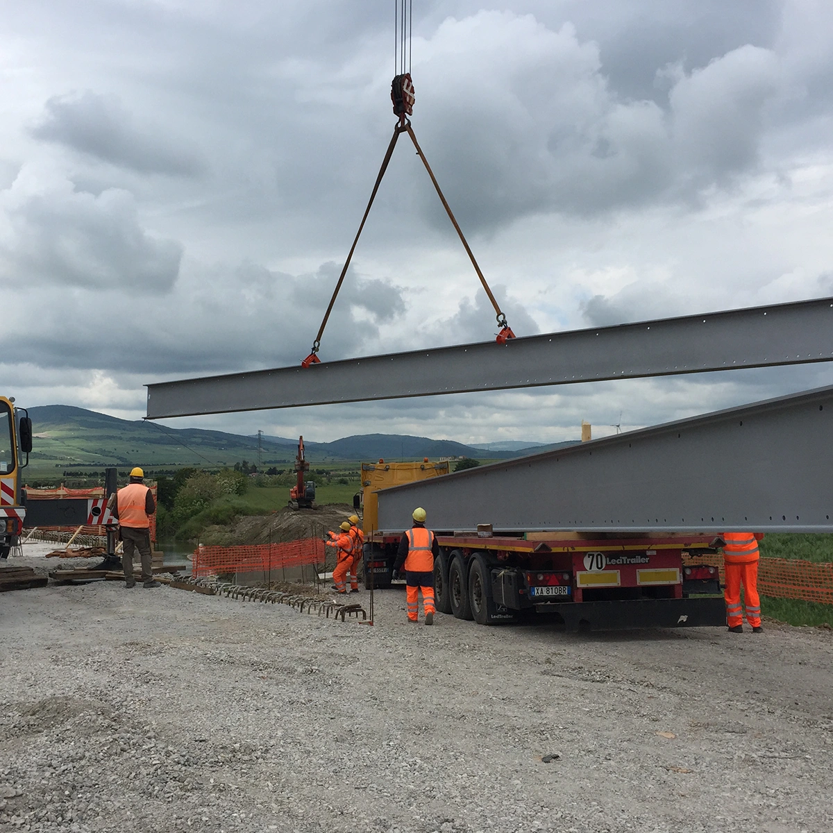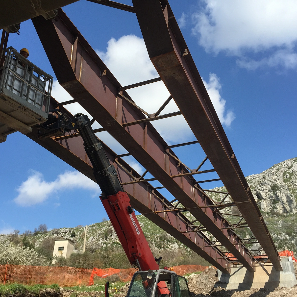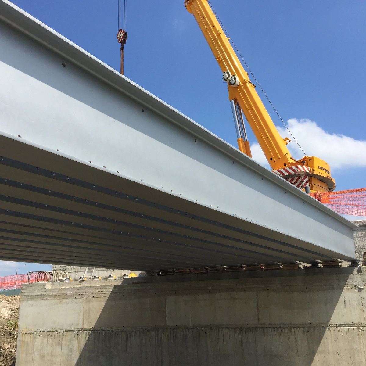 Fasi realizzative, varo: Le attività di cantiere, conseguenziali a quelle presso Stabilimento di produzione, sono state eseguite con montaggio/assemblaggio e saldatura presso le aree di cantiere (in ombra alle spalle) e successivo VARO DAL BASSO degli impalcati con idonee autogru.