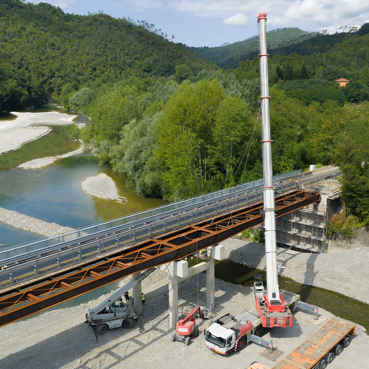 Le attività di cantiere, suddivise nel tempo per corsia (di monte e di valle), sono state pianificate minuziosamente in quanto c’è stata la necessità di operare all’interno e/o in prossimità dei fiume Vara con realizzazione di piste ad hoc per il posizionamento delle autogru di idonea portata per il VARO DAL BASSO.
