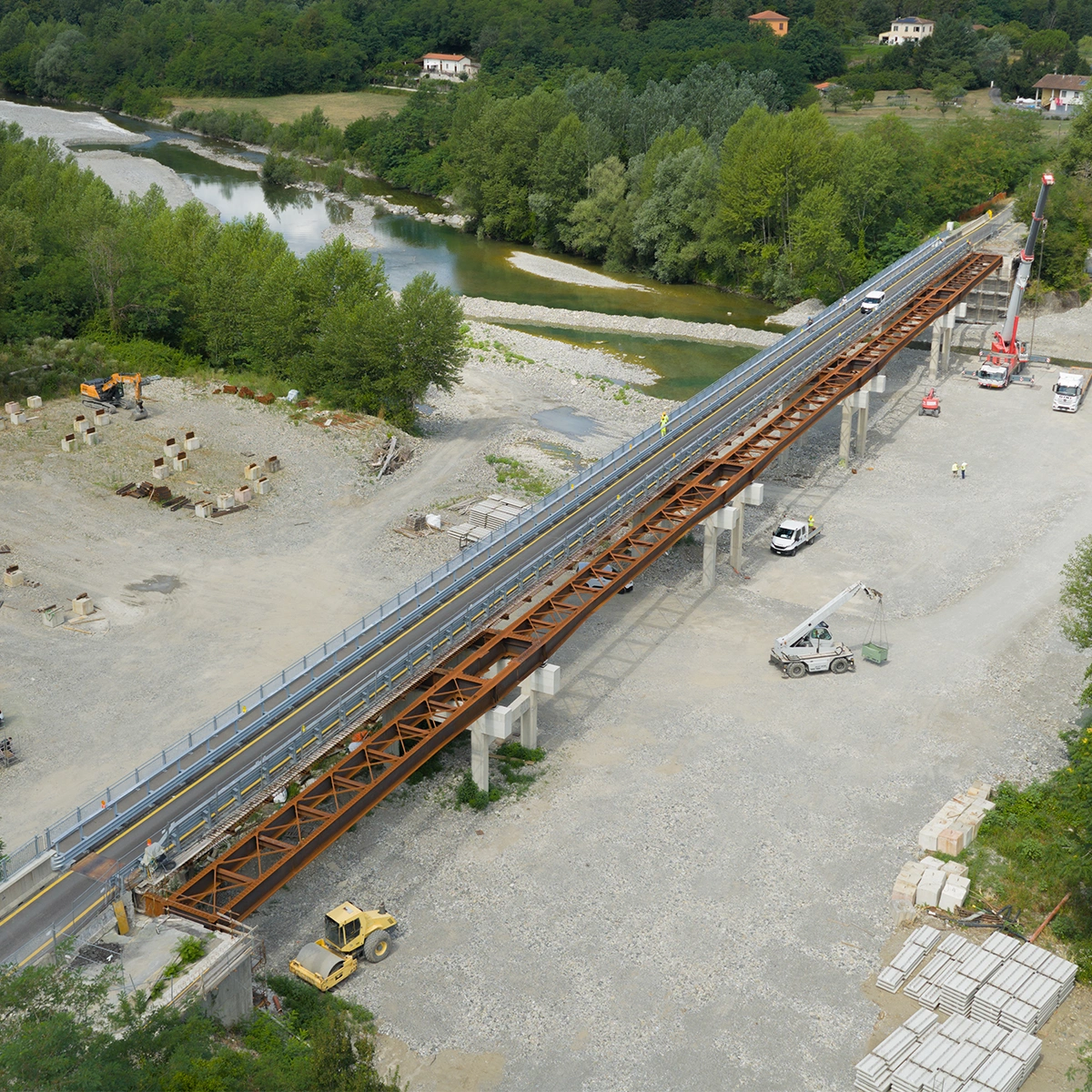 RIO VECCHIAZZANO: lungo circa 30 ml costituito da sistema bi-trave con interasse costante pari a 7,7 m e sbalzi laterali ampi 3,90 m; ognuna delle travi principali è articolata in n. 5 conci ed è composta da travi in composizione saldata. Predalles in acciaio con tralicci elettrosaldati H165.